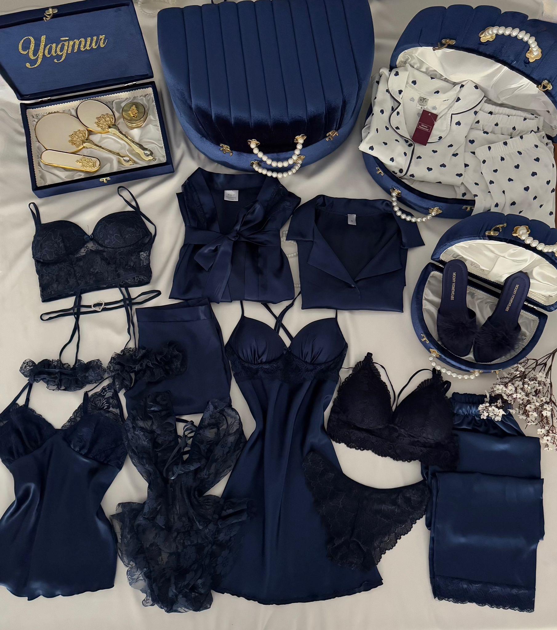 İsme Özel 23 Parça Lacivert Lüks Sultanım Bohça Seti 💙 -23 parça( lüks büyük boy kadife kutu, lüks orta boy kadife kutu,lüks küçük boy kadife kutu, saten gecelik, saten askılı üst, saten şort alt, saten uzun alt, saten sabahlık, saten gömlek üst, tüylü düz taban terlik,isme özel lüks kadife kutu,özel tasarım ayna, tarak, allık kutusu, fırça seti, özel tasarım jartiyer, bralet , külot, penye uzun kol gömlek, penye uzun alt, penye şort alt,fantazi dantel tulum) -s m l xl -75,80,85,90 -ipeksi saten kumaş