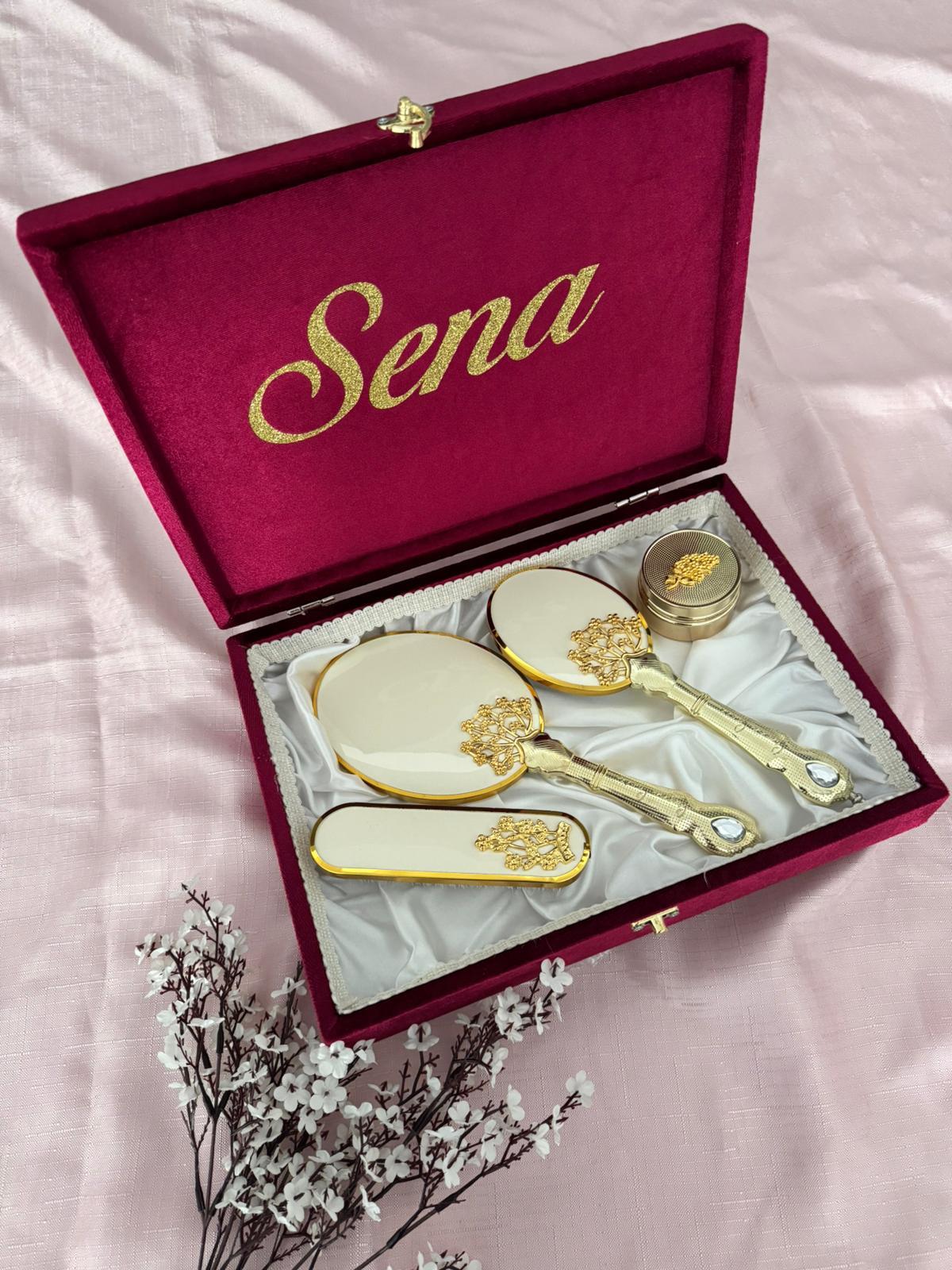Set içeriği: İsme özel gelin ayna tarak kadife kutusu, ayna, tarak, elbise fırçası, allık kutusu