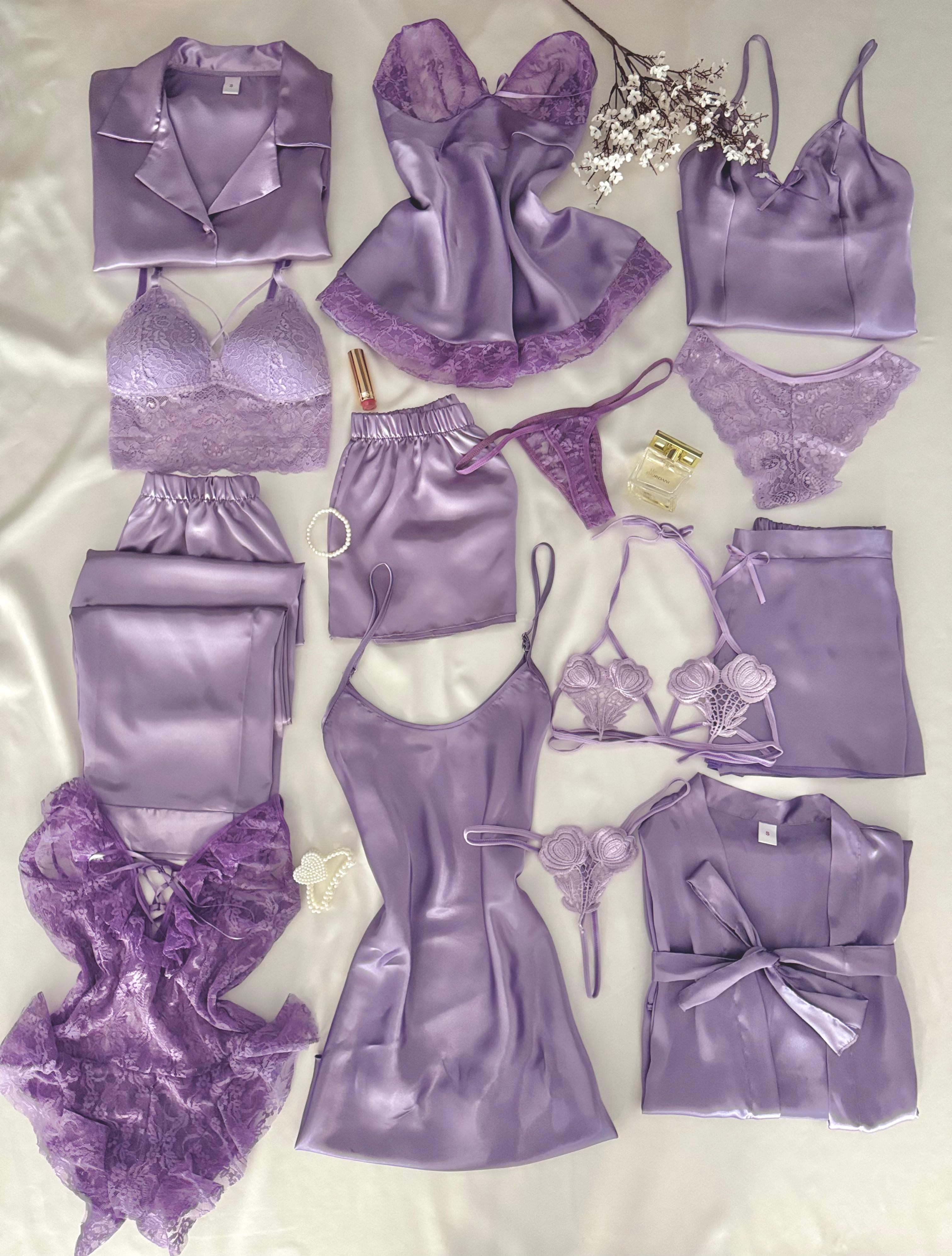 Kutulu 14 Parça October Lila Çeyiz Seti ❤️ -14 parça(saten sabahlık, saten gecelik, saten gömlek üst, saten uzun alt, saten şort alt, dantel tulum, erotik bralet, erotik tanga, askılı saten üst, askılı şort alt, mini saten gecelik, tanga, bralet, külot) -s m l xl -75,80,85,90 -Sipariş için dm atabilirsiniz veya sitemizden sipariş oluşturabilirsiniz.🧚🏼♀️