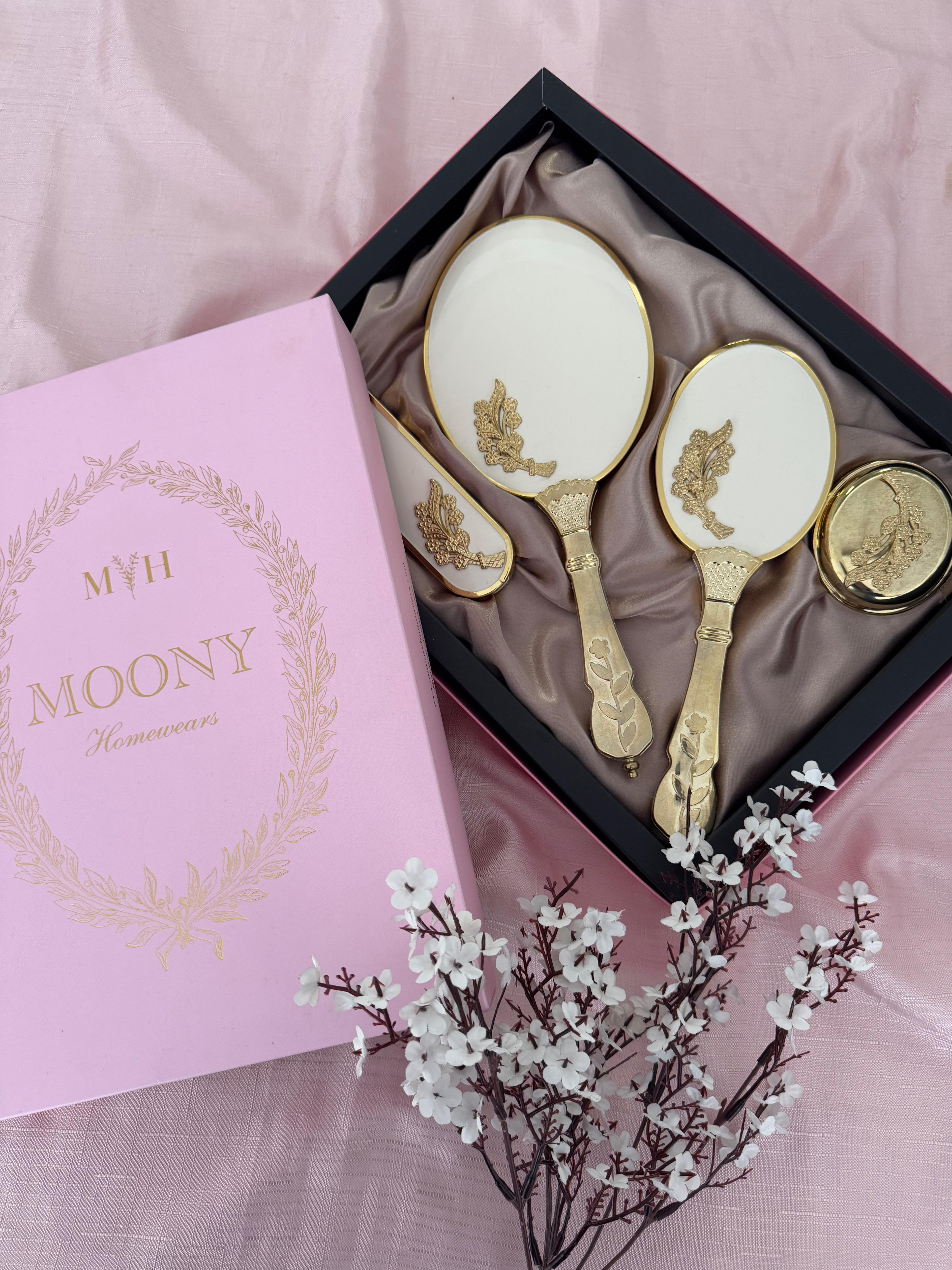 Set içeriği: ayna, tarak, elbise fırçası, allık kutusu
